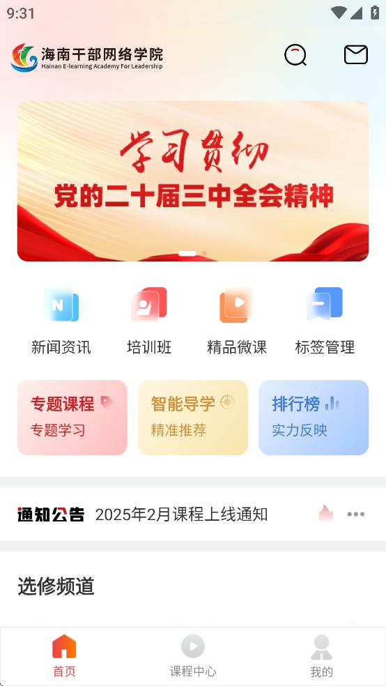 海南干部网络学院app最新版本是专为广大海南干部群体制作的在线培训学习平台,平台拥有首页,课程中心,我的等板块,涵盖了新闻资讯,培训班,精品微课,标签管理等丰富内容,可以帮助用户随时随地移动学习提升自己。