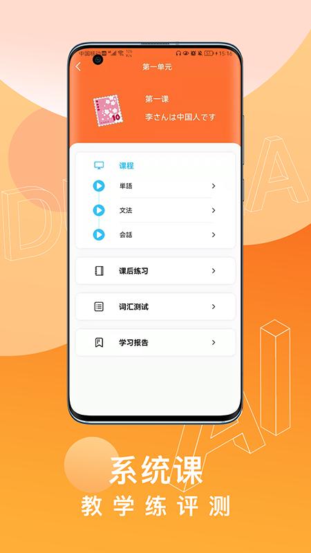 涵盖日语入门五十音图、单词、语法、会话、阅读、听力等各个方面,教学练评测五位一体。