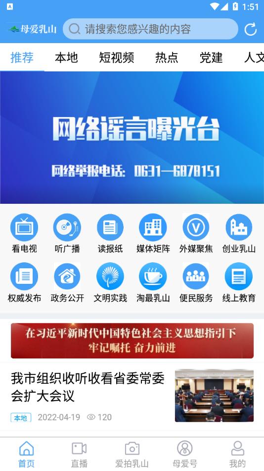 “母爱乳山”开设了头条、资讯、看电视、直播等多个版块及若干子版块,