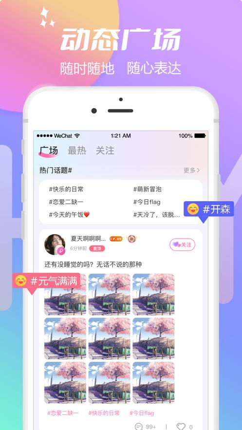 互遇语音app是一款针对年轻人打造的语音交友软件,你可以通过视频、语音、文字、图片展示自己,一键视频语音速配交友,快速匹配异性单身对象,深夜不在孤单。