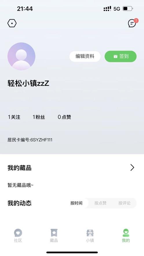 【我的】板块是用户在轻松小镇的独立主页,用户可以在这个页面获取所有个人信息以及藏品信息,我们还为用户建立了个人动态主页,用户所有发布的动态将会在自己的主页进行展示,好友之间也可互相访问个人动态主页进行好友联系打卡。