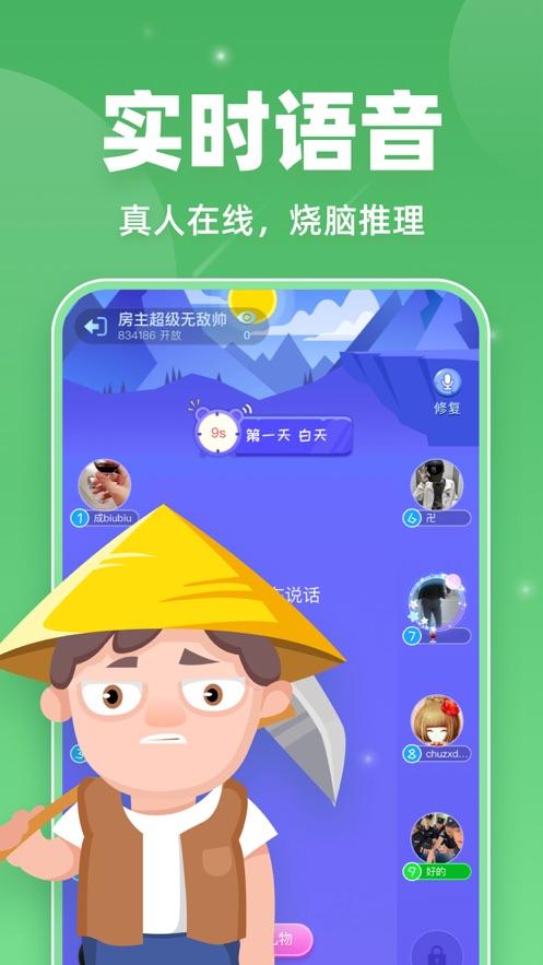 1、实时语音,真人匹配:千万年轻玩家在线组局,烧脑推理,语音交友,一起体验线上桌游的乐趣!