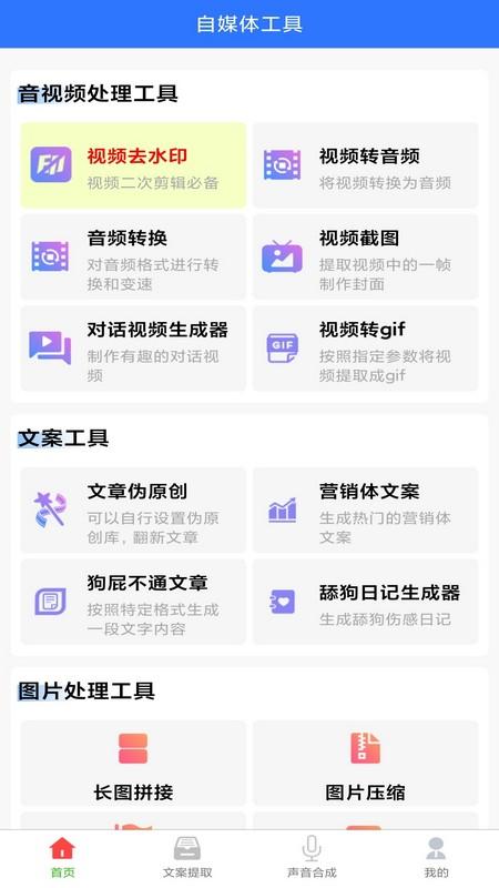 自媒体工具app是一款十分实用的配音解说软件。用户可以通过软件快速进行文字转音频,软件提供了非常自然的人工合成音,用户可以自由调整,还可以在这里进行各种音视频提取和伪原创工具,让用户创作更加方便快捷。