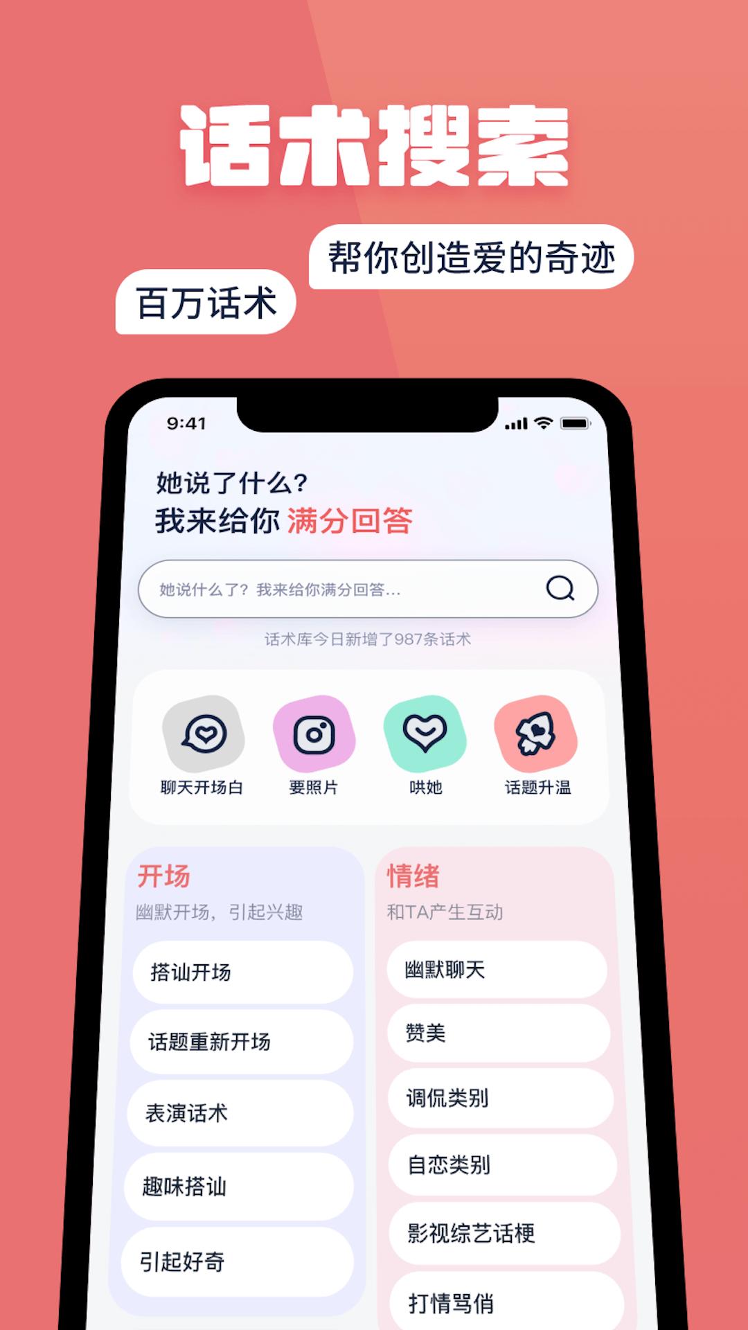 2、 恋爱话术不用记,如果追女生没有话题以及遇到不懂的聊天,只需搜一搜话术就可复制回答轻松搞定。