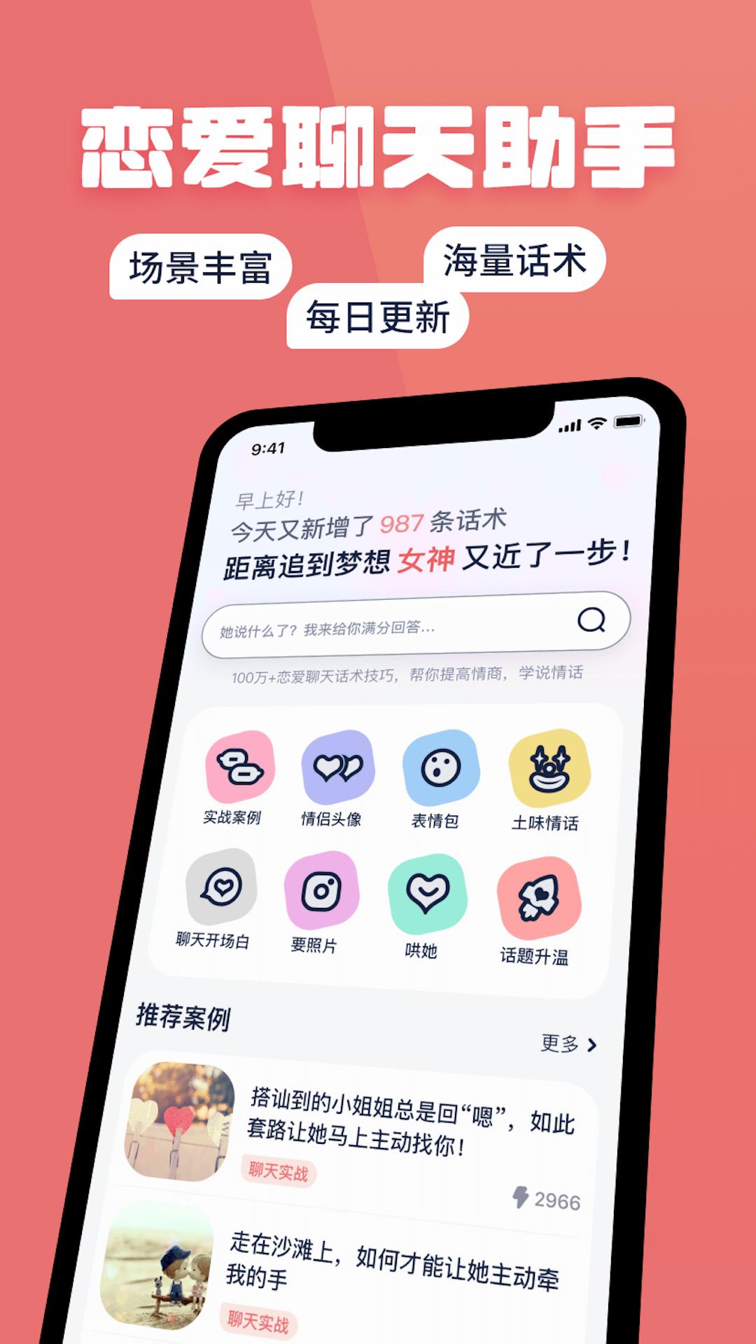 1、这是一款经典的智能聊天神器。 拥有成千上万的可搜索恋爱话术,套路惯例与聊天模板。