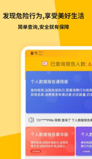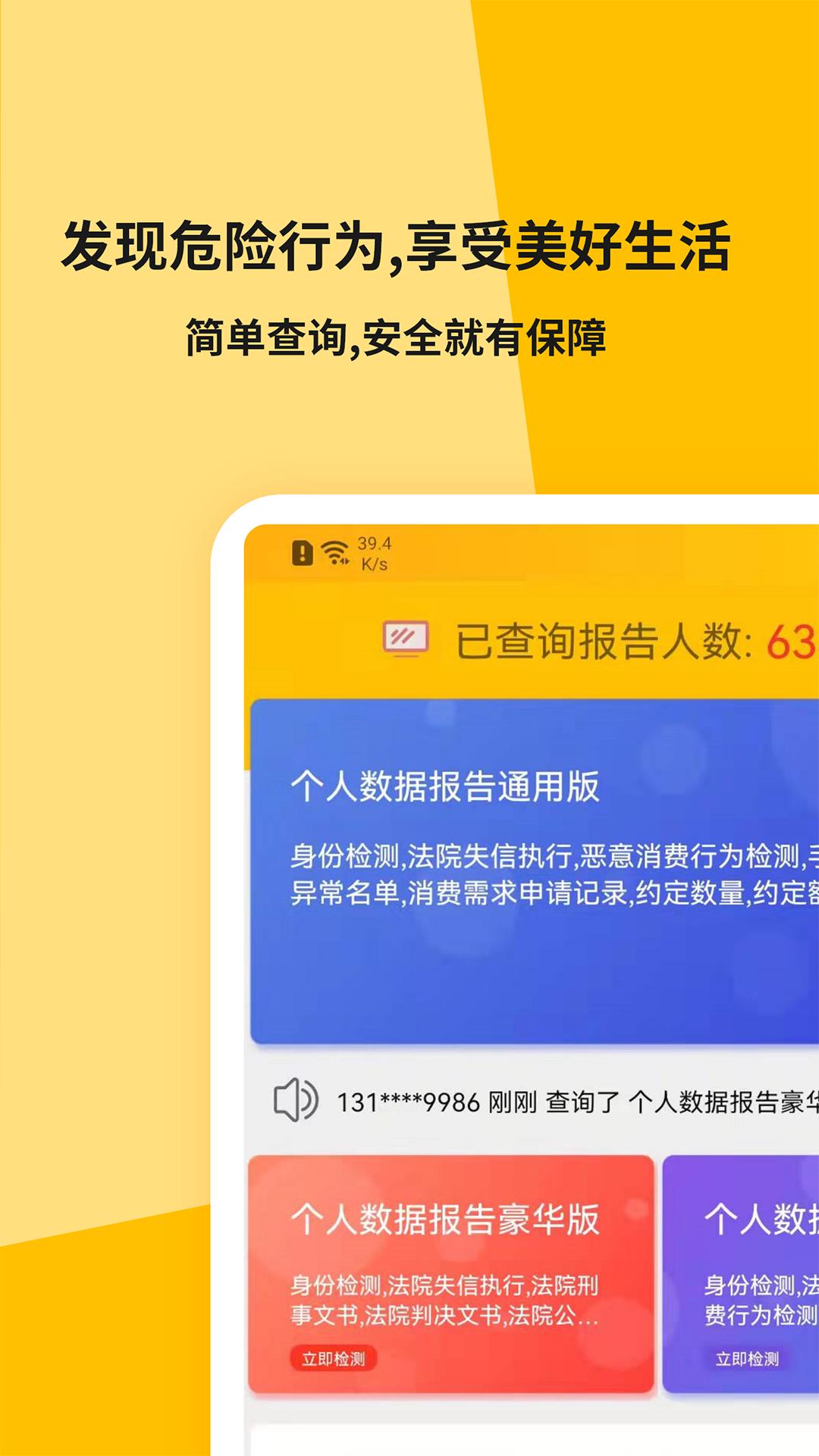 个人数据报告:行为分析、消费申请通过率、诚信名单、羊毛党名单等;为用户个人检测生活危险,检测信息安全等。