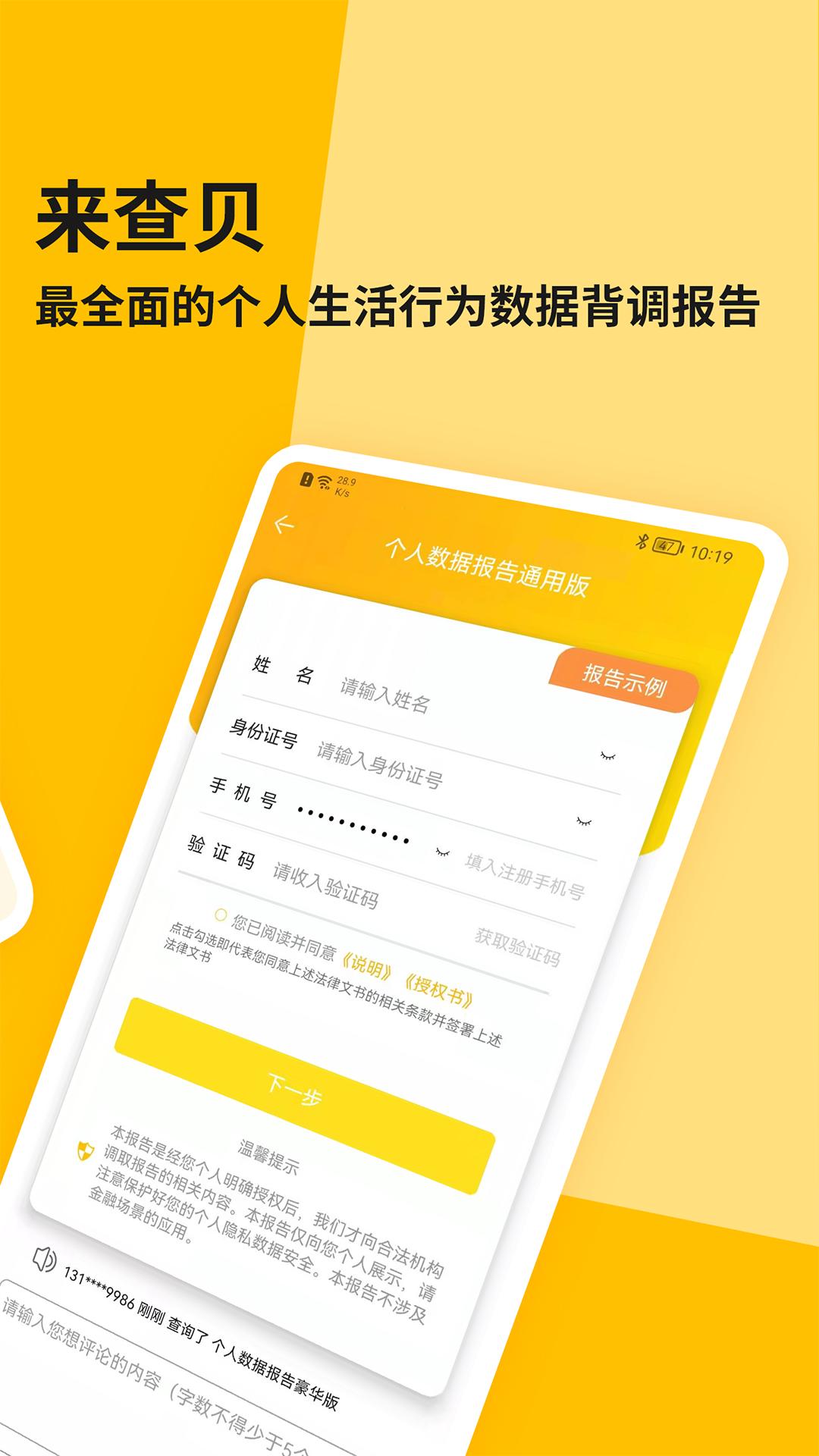 来查贝提供个人数据报告,生活场景类服务查询。在数据时代,个人诚信越来越重要,消费、买房、买车、租赁、找工作等生活各个方面都与诚信信用相关。管理信用,保护诚信用,享受诚信带来的美好生活!