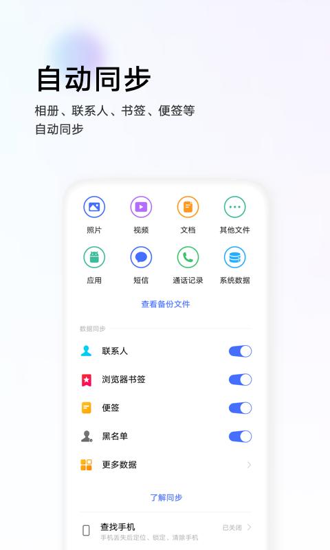 【自动同步】:支持相册、联系人、书签、便签等自动同步