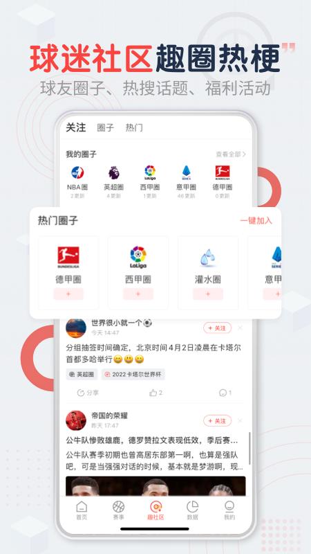 达人、草根、球迷等云集于此,灌水、段子、热帖、观点碰撞,畅聊解球之道。在这里你可发布帖子,参与任意趣梗话题互动,还可加入你兴趣的圈子,与各路球友聊球交友,足篮趣球号荟集,百人榜单观点碰撞,更有精彩活动等你参与。