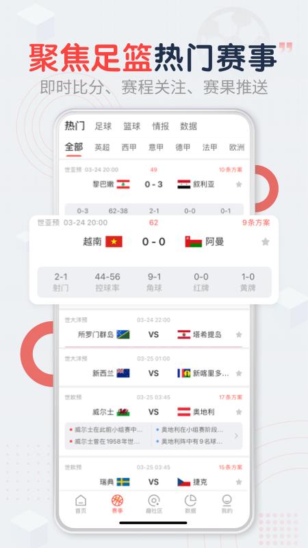 覆盖五大联赛、世界杯、亚洲杯、日职联、NBA等海量足球篮球热门赛事,大小赛程数据一键查阅,提供即时比分实况、深入剖析情报、历史数据实时追踪,更有聊天室等你参与互动,看球不容错过。