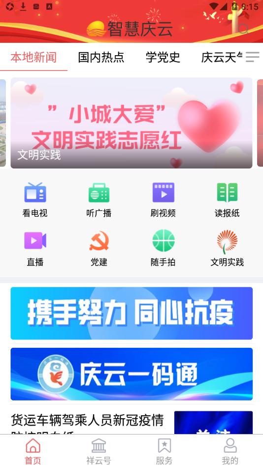 智慧庆云app是专为庆云县制作的融媒体移动平台,平台拥有新闻资讯,电视广播,文明实践,服务等等功能内容,是引导及服务庆云的掌上好帮手。