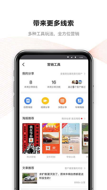 5.营销工具。提供海报、文章、多图、视频分享等工具,丰富车商朋友圈营销的手段,提高线索获取的数量,从而提升受益。