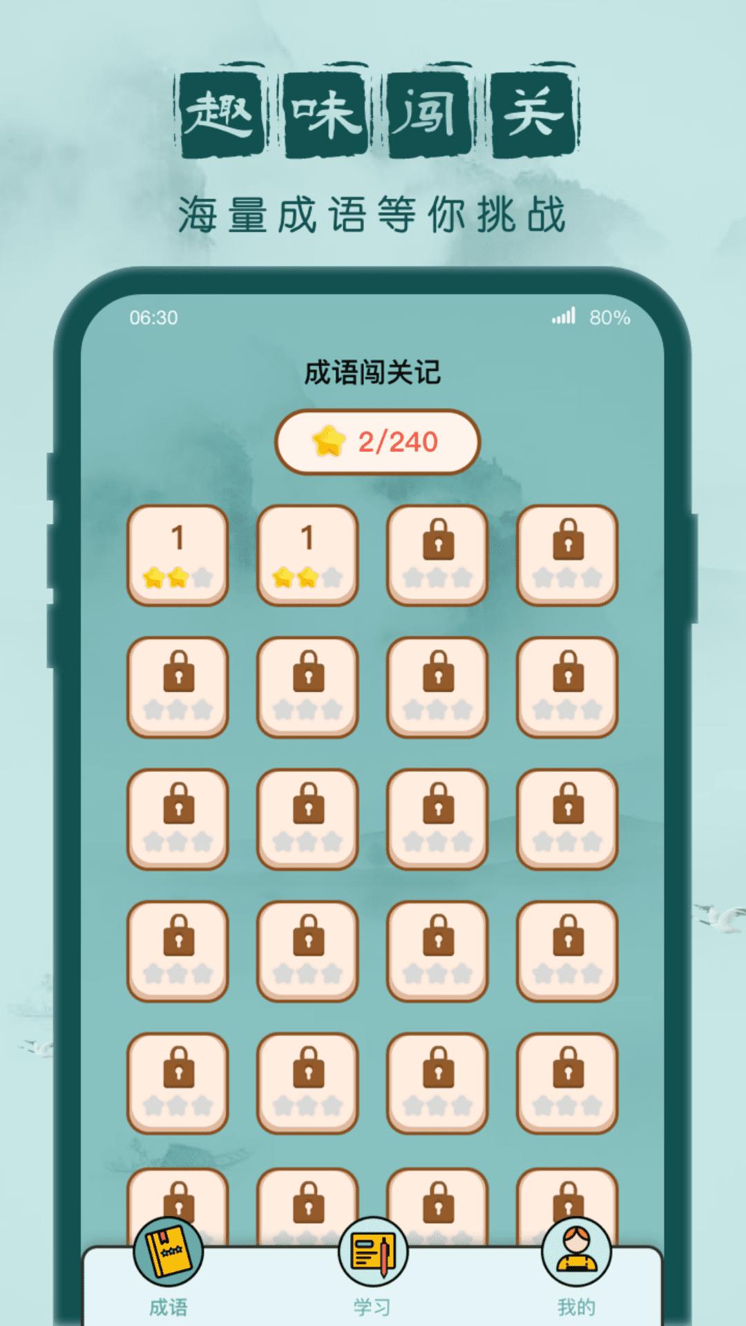 成语闯关记下载安装是一款十分不错的成语学习软件,简洁的画面,学起来十分简单,用户需要将对应字填到空白区,组成正确的成语即可通关,感兴趣的话赶紧来下载试试看