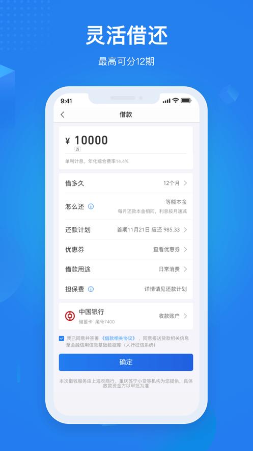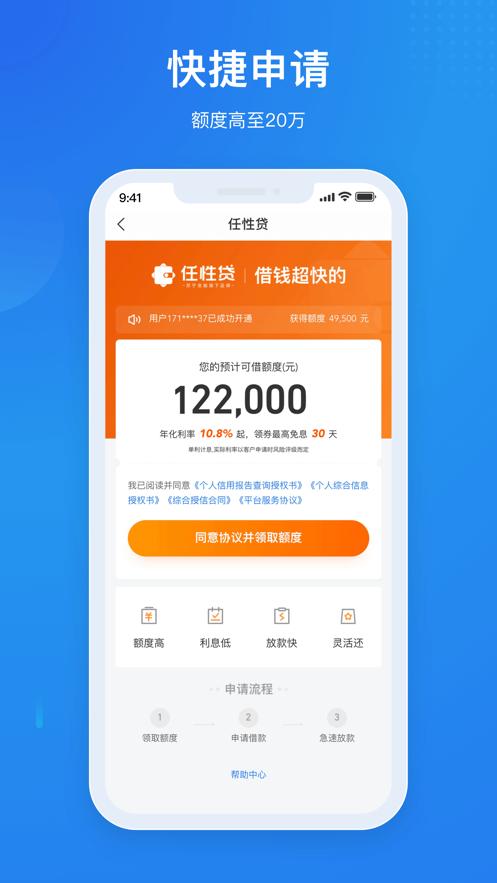 任性贷借款额度高至20万,灵活分期,快速到账,息费透明,年化利率10.8%起(单利),实际利率以客户申请时的风险评级而定,请根据个人能力合理贷款,避免逾期。