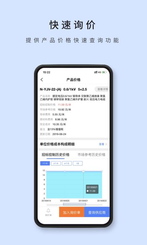 提供产品价格快速查询功能,用户可根据自身需求,选择产品生成询价单,快速查阅产品的实时和历史价格,洞悉产品价格变化趋势和程度。物资云在线实时提供产品的执行标准、工艺技术规范、价格等多维度参考,常见型号全面覆盖、工艺规范严谨透明、定额数据权威可信、原料行情在线监测、价格在线实时更新、历史价格追溯查询。