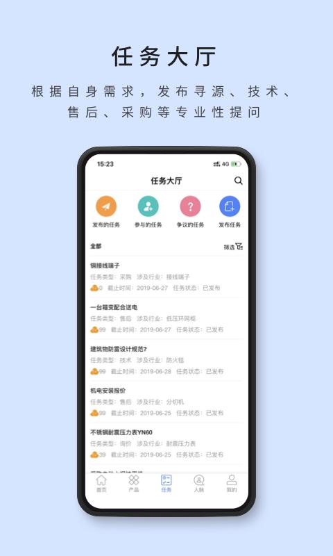 用户可根据自身需求,发布寻源、技术、售后、采购等专业性提问,也可在线参与他人发布的任务提问,在这里会遇到一些志同道合的人,擅长同一领域的专业人士,一起答题互动,一起帮助他人解惑。