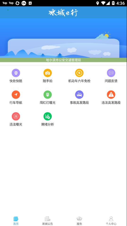 冰城e行app是一款交通出行移动服务应用,软件拥有新闻公告,服务,个人中心等等功能板块,功能强大,使用简单方便,需要的朋友欢迎前来下载使用。