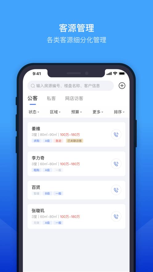 2、为中介门店解决房、客、人精细化管理难题,房客源的管理;