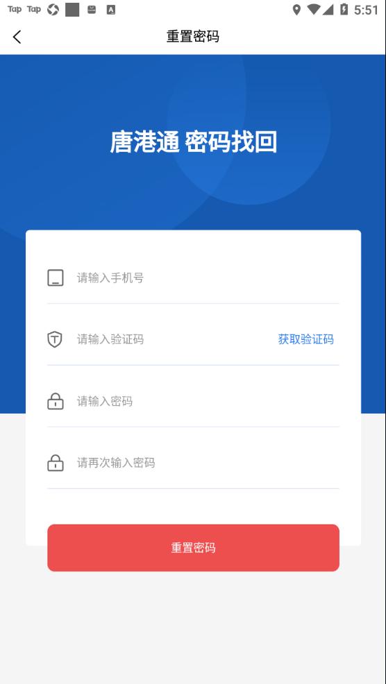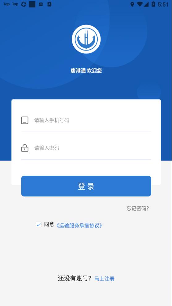 点击唐港通app进入系统 显示登录页面 跳转到注册页面(已经在微信端注册的账号可以继续使用,但是需要重新上传认证信息)