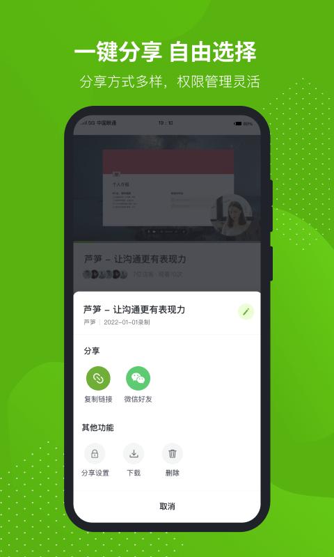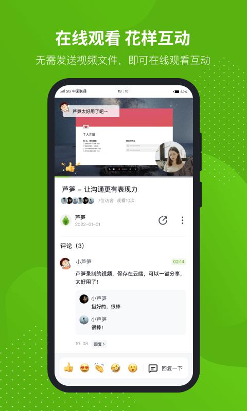 支持屏幕+人像同时录制,视频云端存储,可一键分享视频链接,对方无需下载即可观看和评论。