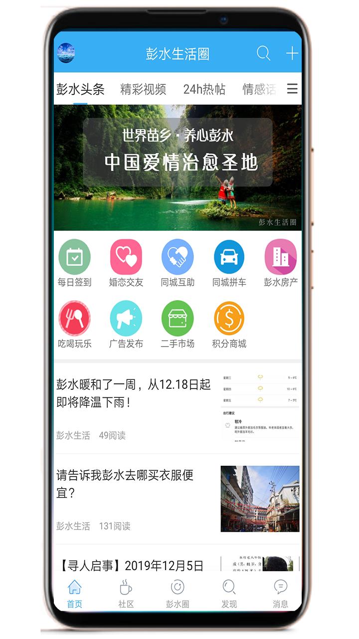彭水生活圈,是为彭水苗族自治县本地人打造的一款生活必备程序。在这里你可以掌握彭水最新的各类新闻资讯,还有生活中遇到各方面的事情都能在此找到答题。