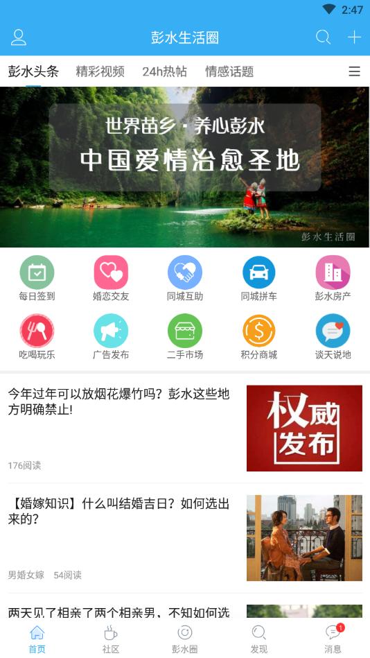 彭水生活圈app是一款由重庆海强广告传媒有限公司开发打造的彭水本地生活服务软件,为用户提供最新的本地资讯、找工作、找房子、找对象一站搞定,还有同城圈子等你来分享生活。