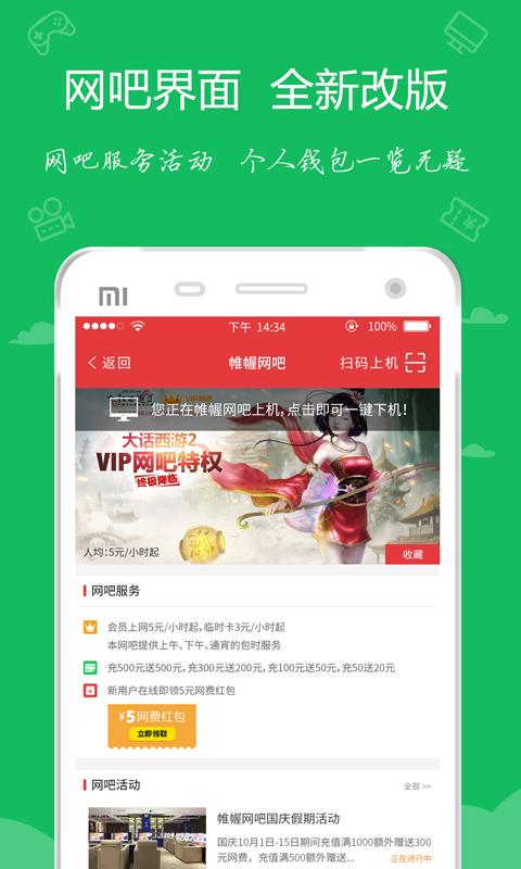 网吧开黑:网吧一键搜索,订座,包时,约玩一手掌握,扫一扫即可上机,远程下机结账减少网费消费。