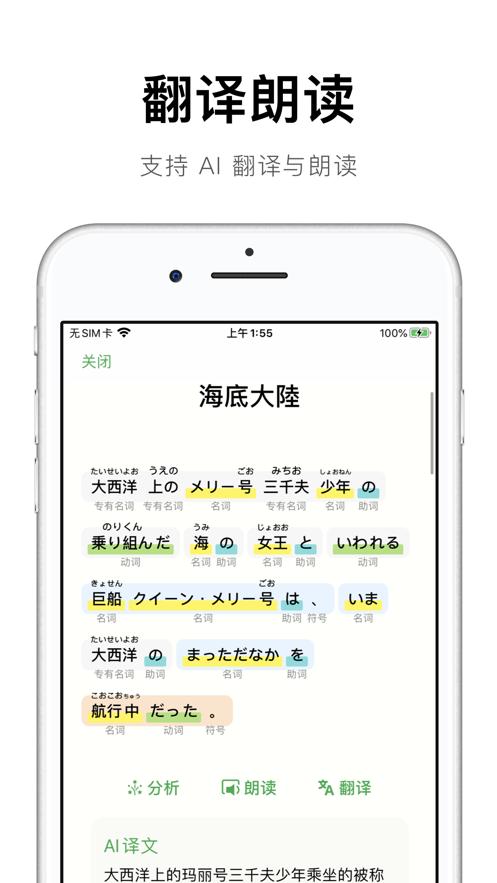 结合机器学习技术,捧读在离线状态下,亦可准确的分析并生成句子、段落的语义结构,整理短句之间的修饰关系,自动推荐语法学习,帮助你理解日语的语法特性与含义
