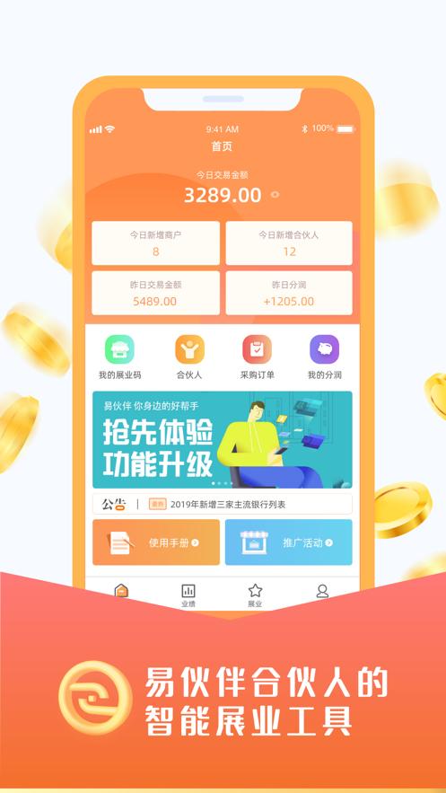 易伙伴是一款智能管理的展业工具,合伙人使用易伙伴来进行发展下级合伙人和直属商户,所有的数据都实时在APP中查询,并可以灵活、方便地设置自己的展业策略,使合伙人展业时更加高效。