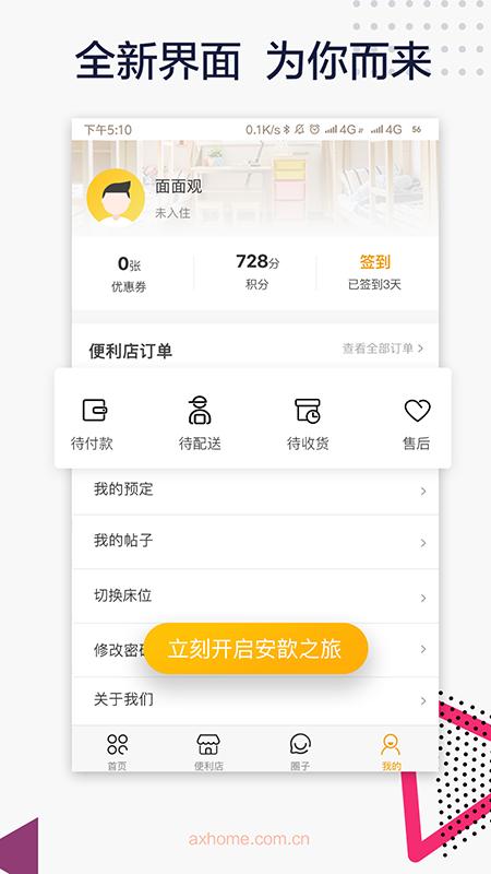 安歆乐活app集合包括员工宿舍、白领公寓,经济酒店在内的全面住宿社区,实现公寓网络化、交友社区、老乡圈、生活圈等全方位互联网服务,提供包括快递、零售、培训、社交、等住宿衍生服务。