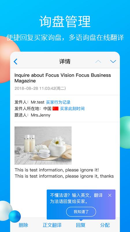 新询盘消息实时推送提醒;查看、回复、分配询盘;询盘单词翻译;买家行为记录(买家信息、往来询盘)。