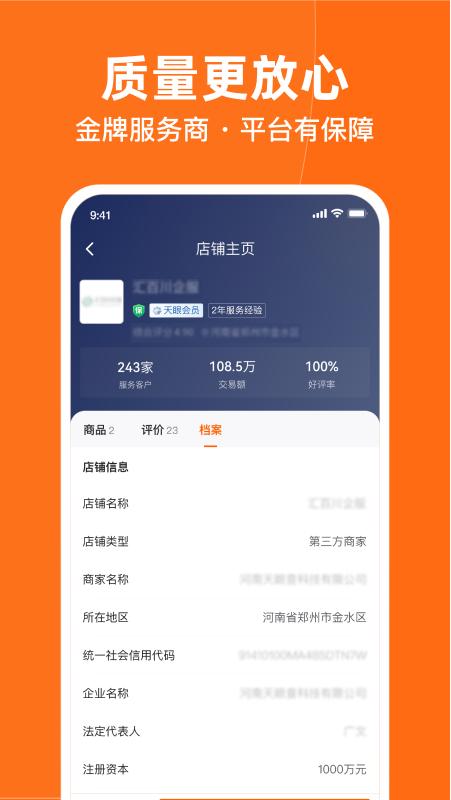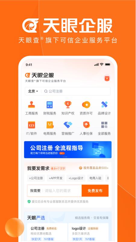 天眼企服是天眼查旗下可信企业服务平台 ,天眼企服致力于为全类型、各阶段的企业提供工商服务、财税服务、知识产权、资质许可、品牌设计、IT/软件、电商服务、营销推广、人事社保等多品类的企业服务,以可信服务、可信价格、可信评价,为用户分担经营压力,从而让企业更专注于生产、研发、销售等核心工作。