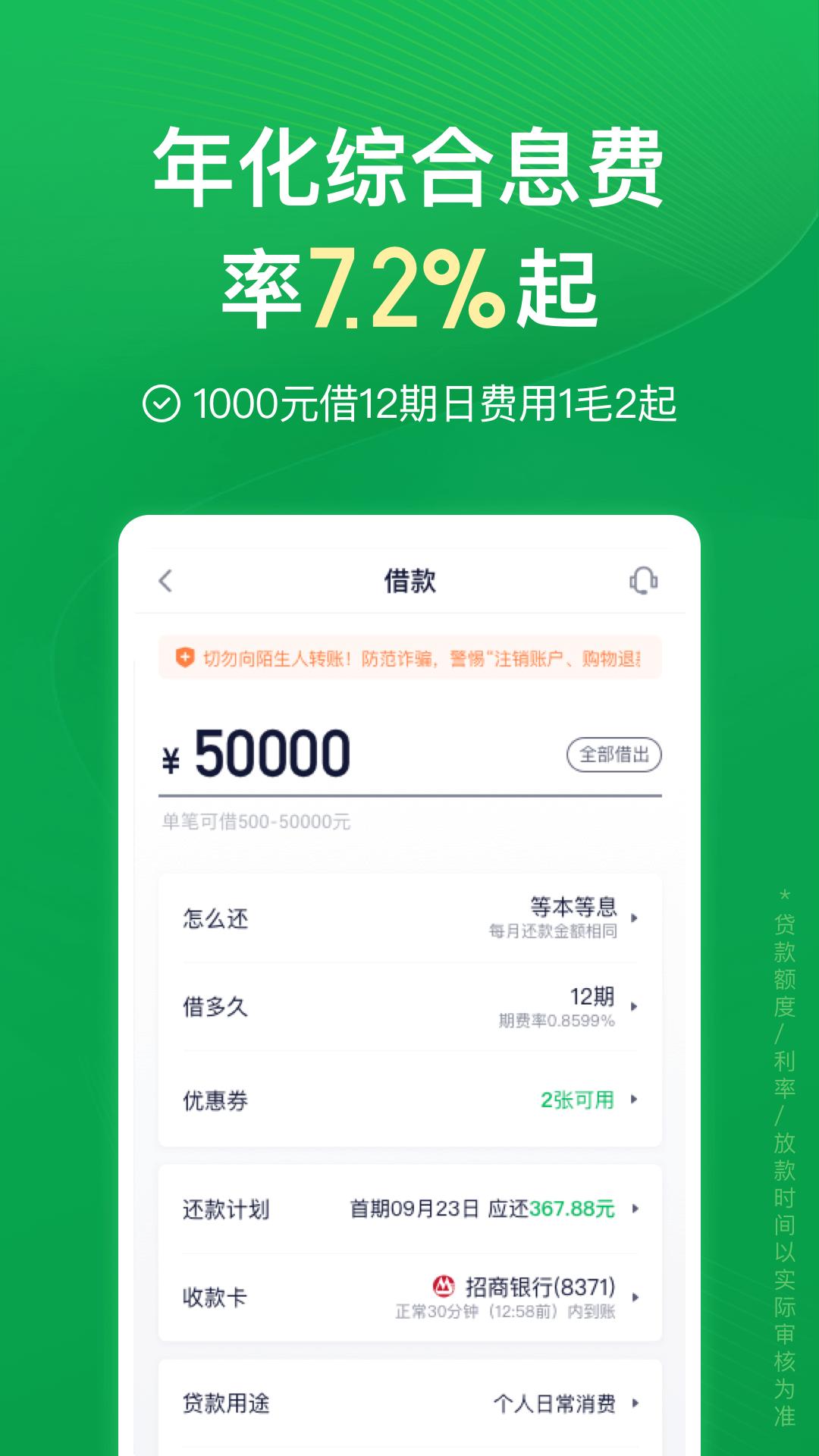 1千元12期日息费1毛2起,年化综合息费率7.2%起(以审核为准)。