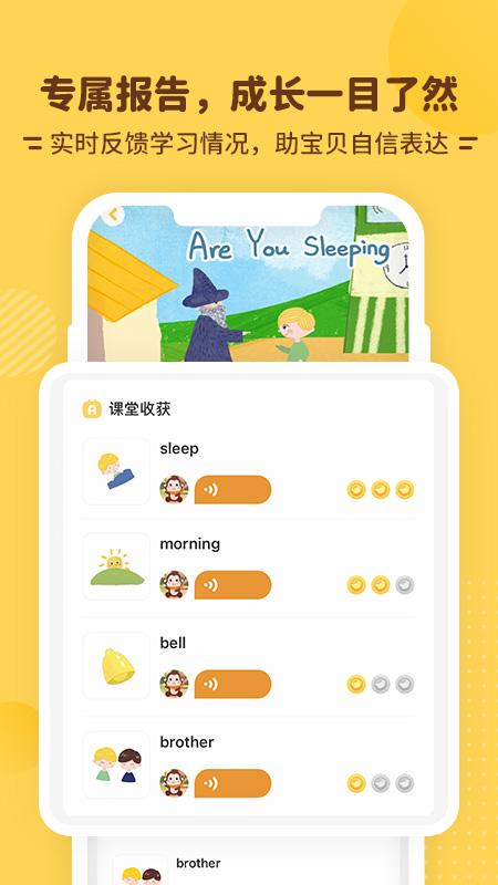唱唱启蒙app是一款专为儿童打造的英语启蒙学习,通过生动有趣的AI互动课程让孩子对说英语产生浓厚的兴趣,智能测评让0基础爸妈可以无压力辅助教学,真人发音示范让孩子英语启蒙赢在起跑线。