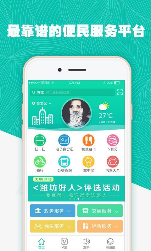 “潍V”是定向潍坊开发的智慧城市创新应用平台,以智慧民生、智慧生活、智慧政务为主线以城市服务为抓手,将贴近百姓生活的社交、娱乐、购物、支付、政务、健康、教育、交通、旅游、社区等服务整合到移动端,促进了市民、企业、政府三方的良性互动,创造了一种全新、优质、高效的城市生活,让市民共享智慧潍坊建设带来的成果与福利。