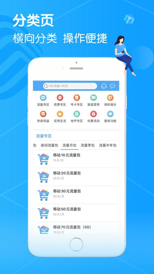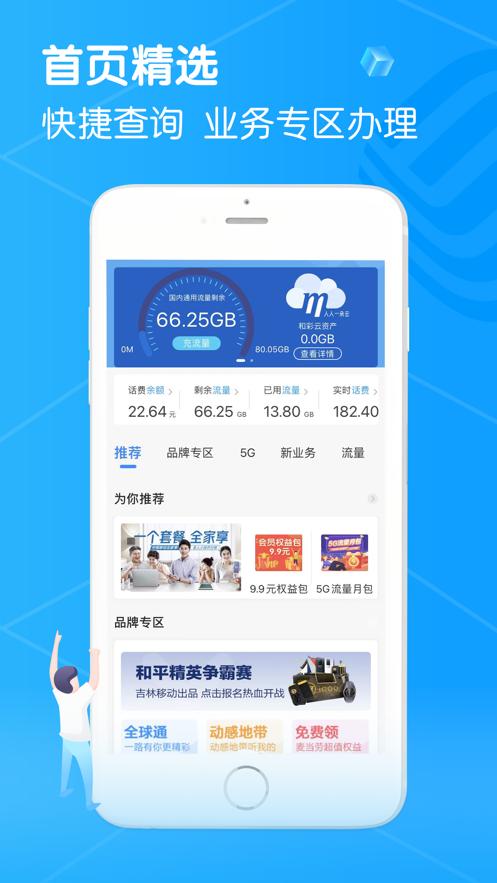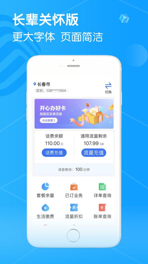 集账单查询、流量查询、话费充值、套餐办理、权益专区、优惠活动、生活娱乐等服务于一体,便捷服务省时省心。