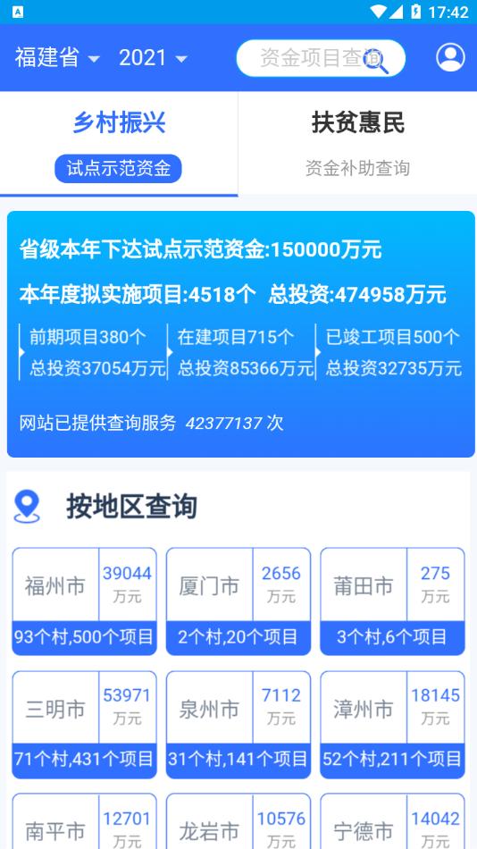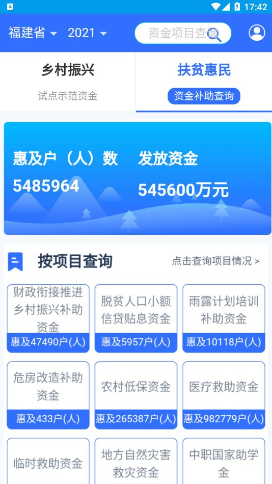 福建乡村振兴可查询发放到人到户的补贴资金、乡村振兴试点示范补助资金、农业新型经营主体和村级三资运行情况等,