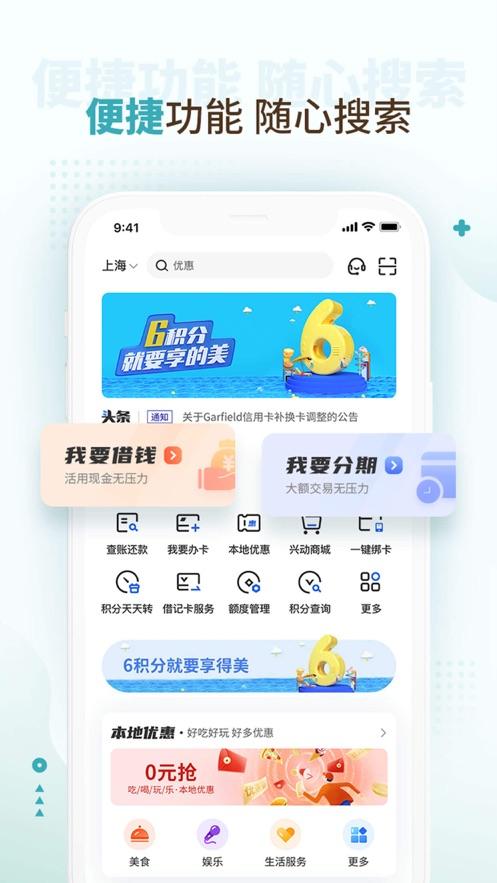 便捷功能,随心搜索,多种用卡服务更贴心,全面尽享好多优惠“好兴动”!