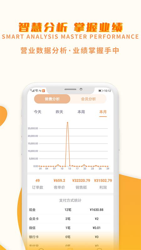 3、营业的数据分析,将业绩掌握在中,智慧分析,灵活收银。