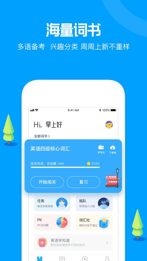 内置小学、初高中、四六级、新概念、新标日、雅思托福、商务英语、出国留学等经典教材,囊括各行各业近300本词书,每个学习者都能找到适合自己的内容;