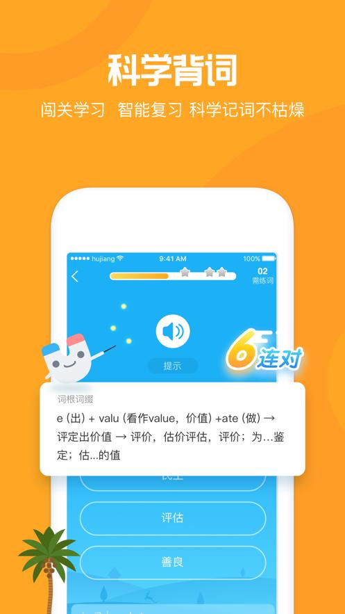 独特高效的游戏闯关背词模式,想背后面先过这关,把握节奏,越背越爽,最高记录一天背诵5445词!背单词原来也可以这么有意思!