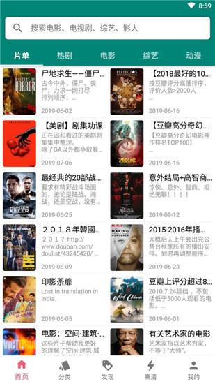 资源猫app破解版是一款第三方影视聚合神器。打开软件,在软件首页有个片单专栏,收录了非常多的影视合集,不同类型进行聚合推荐,古装,喜剧,豆瓣高口碑等等,简直是剧荒必备。
