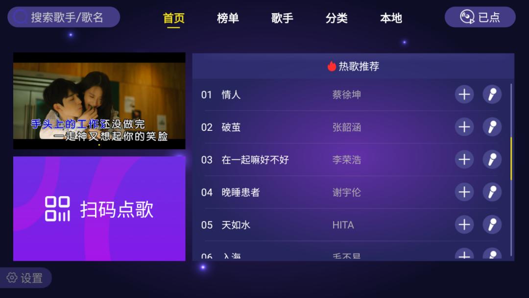 家庭KTV是一款可以安装到电视的K歌神器。它是无广告版的,而且软件所有歌曲都是免费的,顶部有首页、榜单、歌手、分类、本地音乐五个栏目。有了这款软件,大家在家就可以畅想免费k歌服务。