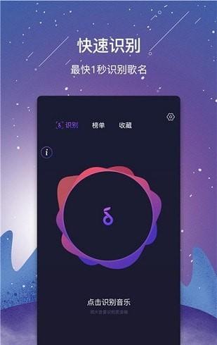 3、快速识别:一键点击就能识别音乐,最快可一秒识别,还支持收藏和分享,也有音乐榜单可听。