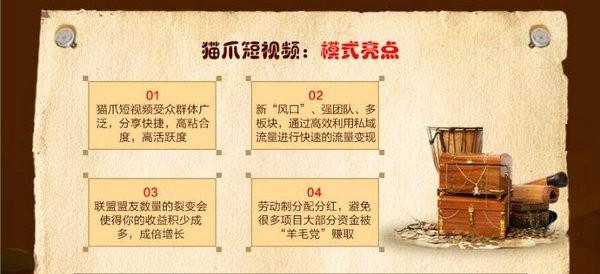 1、独创猫爪短视频寻宝玩法,勇士竞成王者,共逐联盟红利,不断吸引新用户,服务老用户。