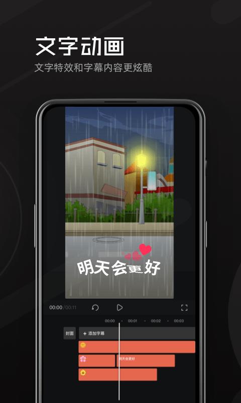 3、文字动画添加:文字特效和字幕内容超炫酷,样式多好选择,封面、字幕等任意调整,创意无限。