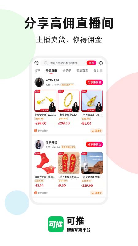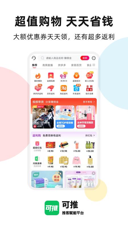可推是国内首款短视频导购分销平台,与拼多多、淘宝、京东等主流电商平台合作,可推免费提供海量短视频与商品以及聚合最热门带货直播间,你可以通过分享短视频或者直播间获得返佣。