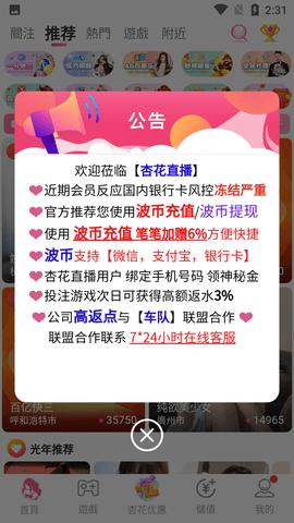 杏花直播是一款能够让你更加畅快体验到精彩直播节目的手机软件,都可以在这里发现更多精彩的直播内容,更多不一样的直播节目都可以在这里看到,找到自己心动的美女主播,轻松的满足你的所有需求,还有更多你喜欢的精彩直播节目都可以在这里看到。