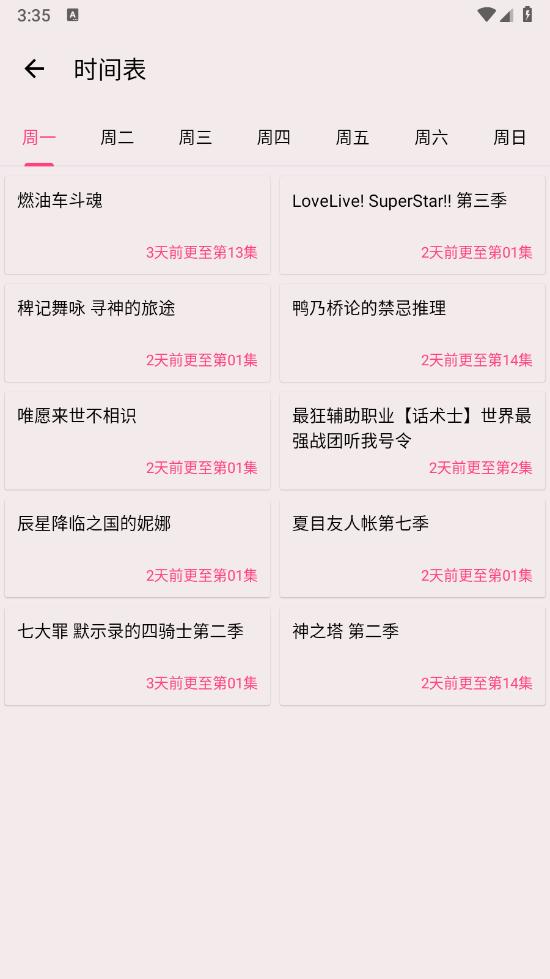 2、在“新番时间表”页面,为漫迷们提供一周每天动漫更新情况。