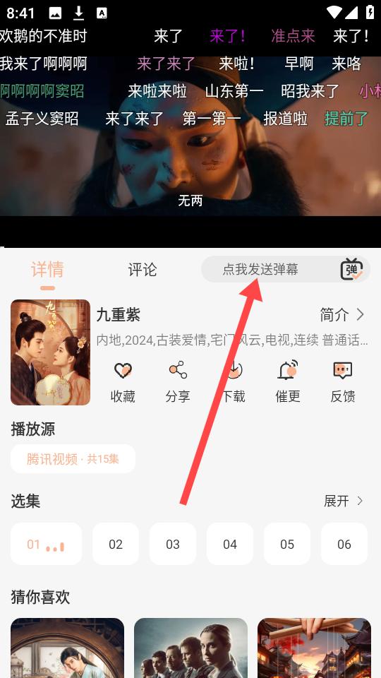 6、点击下方箭头所指的图标,还可以实时发送弹幕哦。